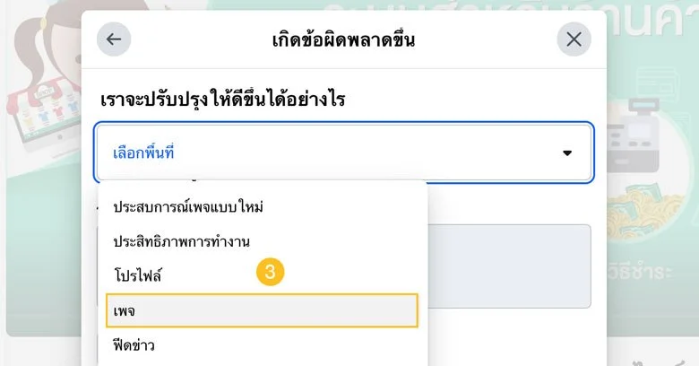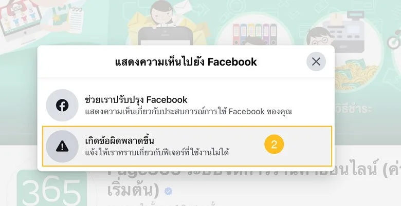 2. เลือก “เกิดข้อผิดพลาดขึ้น” เพื่อเป็นการรายงานว่าเพจติดเหลือง เพจติดแดงว่ามาจากความผิดพลาดของระบบ